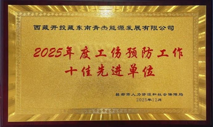 12月9日,昌都市人力資源和社會保障局授予西藏開投藏東南青杰能源公司“2025年度工傷預防工作十佳先進單位”稱號,以表彰公司在工傷預防與安全管理方面取得的扎實成效。