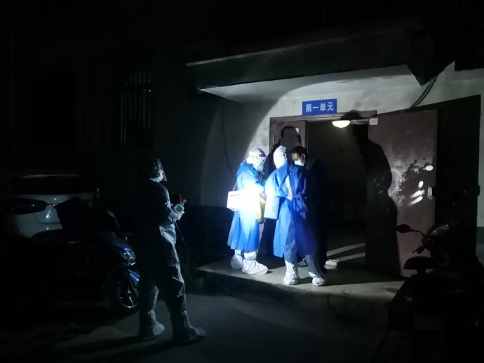 在做好防護(hù)準(zhǔn)備后,扯起嗓門開始耐心的給即將入睡的百姓做起動(dòng)員。在疫情期間,經(jīng)歷了漫長(zhǎng)的等待,蝸居在家的市民大多習(xí)慣了早晚無(wú)序的核酸檢測(cè),但還有不少以身體不適、經(jīng)不起“磨煉”等理由進(jìn)行躲避、抗拒,隊(duì)員們不厭其煩,只能冒著風(fēng)險(xiǎn)逐戶登門做思想工作。舉燈踱步、排門逐戶做完檢測(cè)一眨眼三個(gè)多小時(shí)過去了,再做好試管封裝,數(shù)據(jù)統(tǒng)計(jì)、校對(duì)后已至子夜后半段,深秋微涼的晚風(fēng)已被隊(duì)員的熱情牢牢抵御在防護(hù)服之外。