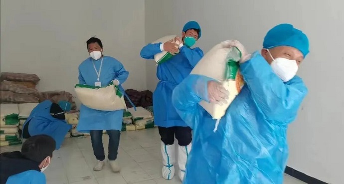 還來(lái)不及調(diào)整夜班后的身體疲倦,次日中午時(shí)分,志愿服務(wù)隊(duì)就收到了社區(qū)進(jìn)行國(guó)慶政府慰問物資配送的通知。為保證社區(qū)居民能享受到最新鮮、及時(shí)的慰問物資,隊(duì)員們重打前一晚的雞血,頂著淅淅瀝瀝的小雨和感冒被感染的風(fēng)險(xiǎn),再次手抓肩扛,將包裝完好的合計(jì)約5噸的糧油水果送到了居民手中。匆忙的腳步、簡(jiǎn)單的交流,也讓社區(qū)百姓們漸漸讀懂了志愿服務(wù)隊(duì)的初心。