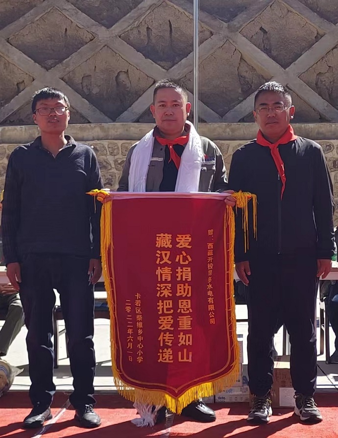 果多水電公司代表張二林同志作了題為“祖國的未來,民族的希望”的講話,并代表果多水電公司給學(xué)校捐贈(zèng)了學(xué)習(xí)用品,足球、排球、羽毛球等,勉勵(lì)孩子們要樹立遠(yuǎn)大理想,努力學(xué)習(xí),健康成長,以優(yōu)異的成績回報(bào)社會(huì)、回報(bào)祖國。柴維鄉(xiāng)小學(xué)贈(zèng)送了“愛心捐助恩重如山,藏漢情深把愛傳遞”的錦旗,感謝果多水電公司對學(xué)校的關(guān)心支持幫助。