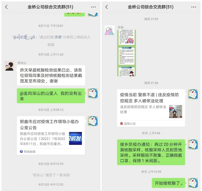 付少龍通過微信工作群及時將區(qū)、市、縣、公司疫情防控工作決策部署、防控政策措施、疫情防控違法違規(guī)行為等傳達(dá)給全體員工,引導(dǎo)員工做好自身防護的同時,做到不信謠、不傳謠、不恐慌、不松懈。