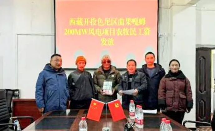 11月28日、12月2日,西藏開投那曲河水電公司組織舉行色尼區(qū)曲果嘎姆200MW風電項目農(nóng)牧民工資發(fā)放儀式,為羅瑪鎮(zhèn)、香茂鄉(xiāng)5個村共計338人發(fā)放工資129.96萬元。
