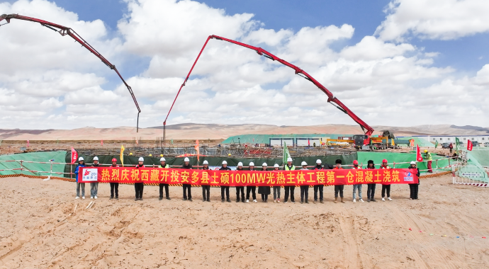4月28日,西藏開投安多土碩100兆瓦光熱+800兆瓦光伏一體化項(xiàng)目迎來關(guān)鍵節(jié)點(diǎn)——聚光集熱塔基礎(chǔ)第一倉混凝土順利澆筑完成。為后續(xù)吸熱塔主體澆筑及定日鏡安裝奠定了堅(jiān)實(shí)基礎(chǔ)。