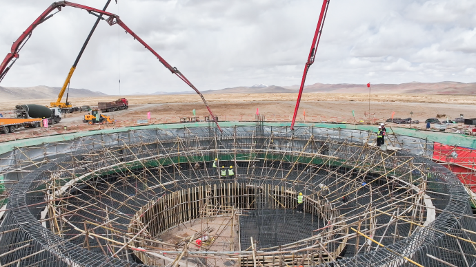 安多土碩光熱光伏一體化項(xiàng)目聚光集熱塔基礎(chǔ)完成第一倉混凝土澆筑。趙苑余 攝