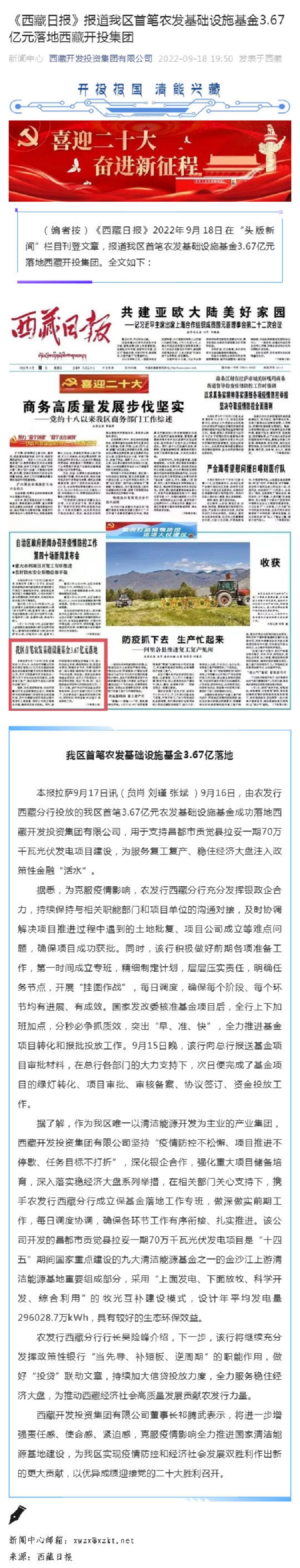 《西藏日報(bào)》報(bào)道我區(qū)首筆農(nóng)發(fā)基礎(chǔ)設(shè)施基金3.67億元落地西藏開投集團(tuán)