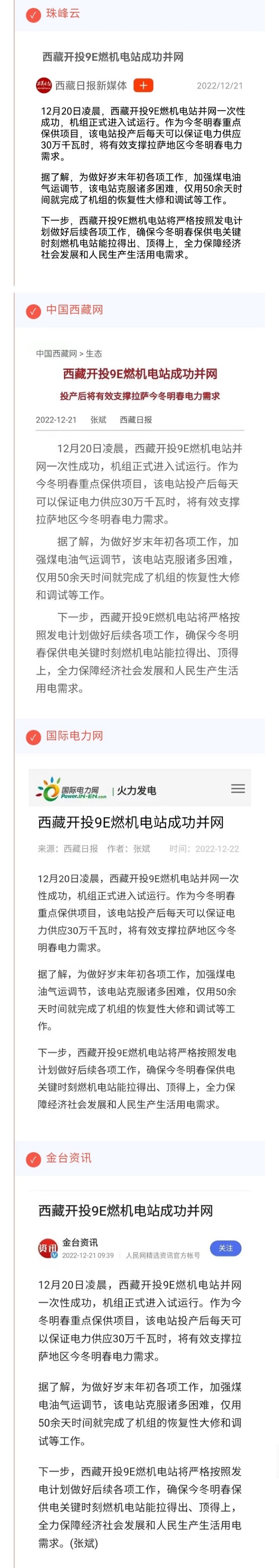西藏衛(wèi)視(西藏新聞聯(lián)播)、珠峰云、中國(guó)西藏網(wǎng)、國(guó)際電力網(wǎng)及金臺(tái)資訊等媒體報(bào)道西藏開投9E燃機(jī)電站成功并網(wǎng)