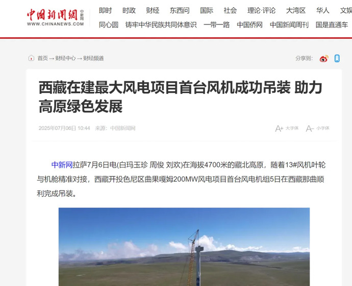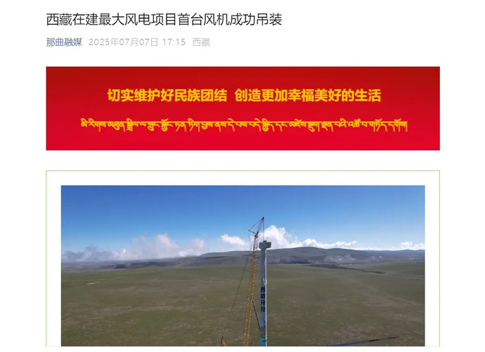 媒體報道丨西藏在建最大風(fēng)電項目完成首臺風(fēng)力發(fā)電機(jī)組吊裝