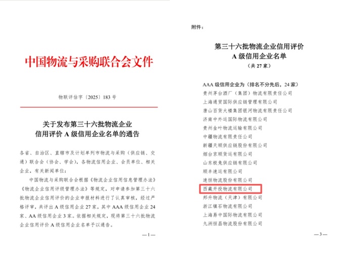近日,中國物流與采購聯(lián)合會公布了第三十六批物流企業(yè)信用評價A級信用企業(yè)名單,西藏開投物流有限公司獲評“AAA級信用企業(yè)”。