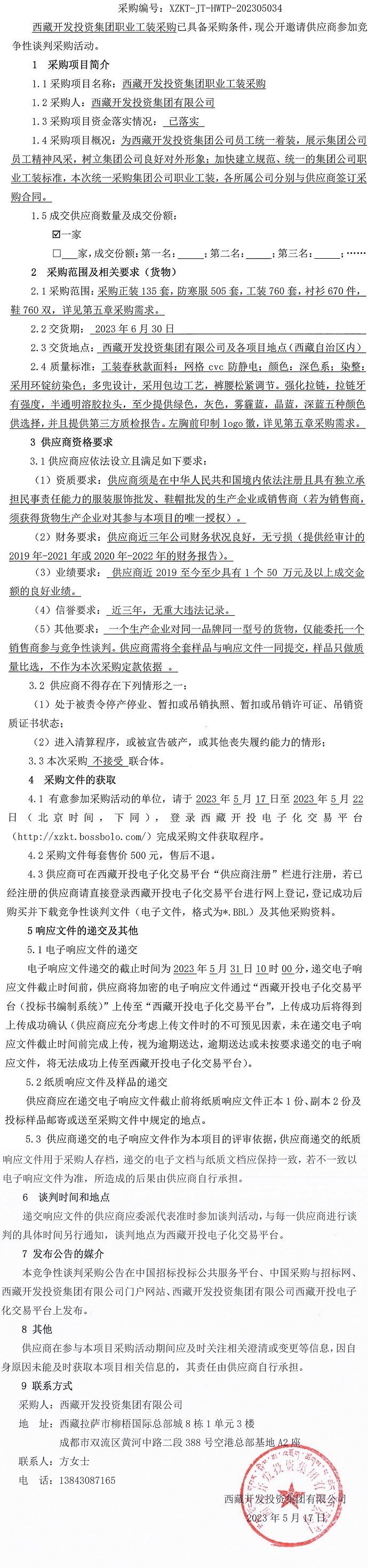 西藏開發(fā)投資集團(tuán)職業(yè)工裝采購競(jìng)爭(zhēng)性談判采購公告