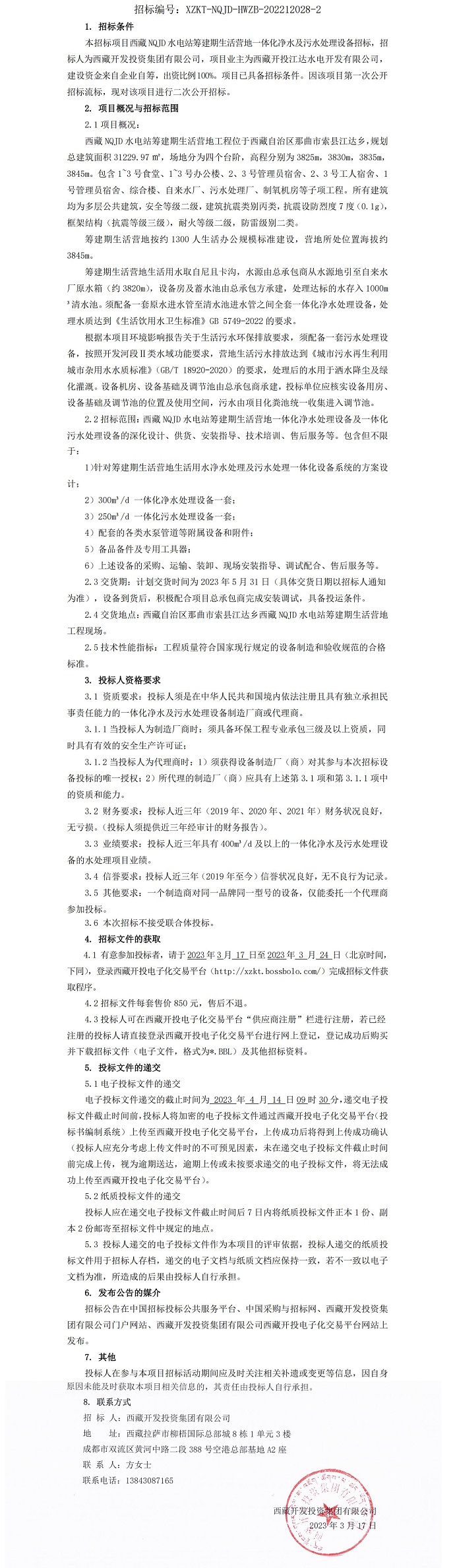 西藏 NQJD 水電站籌建期生活營地一體化凈水及污水處理設備招標公告