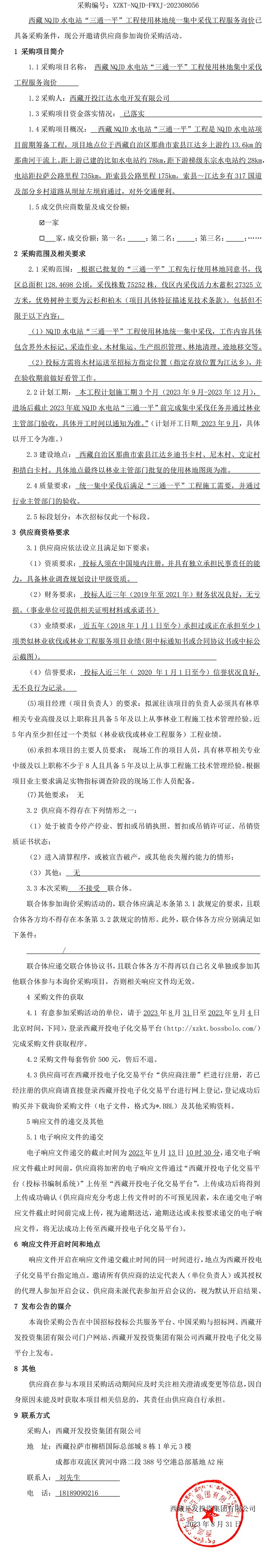 西藏NQJD水電站“三通一平”工程使用林地統(tǒng)一集中采伐工程服務詢價采購公告