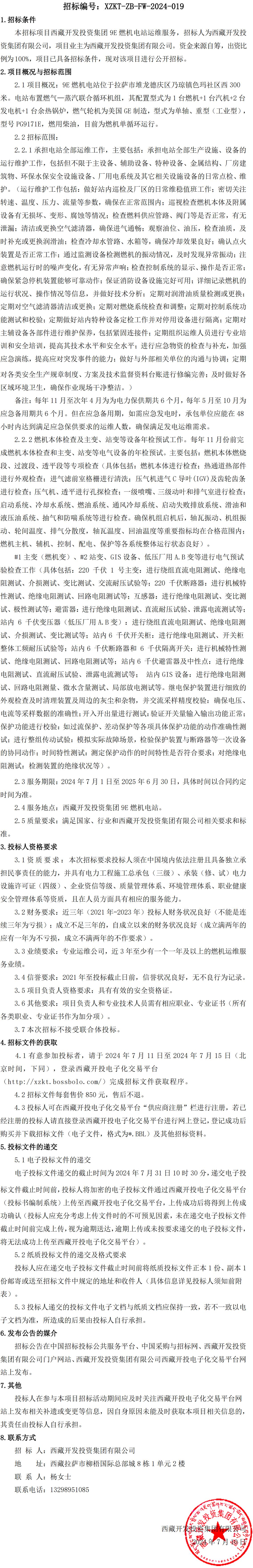 西藏開發(fā)投資集團9E燃機電站運維服務招標公告