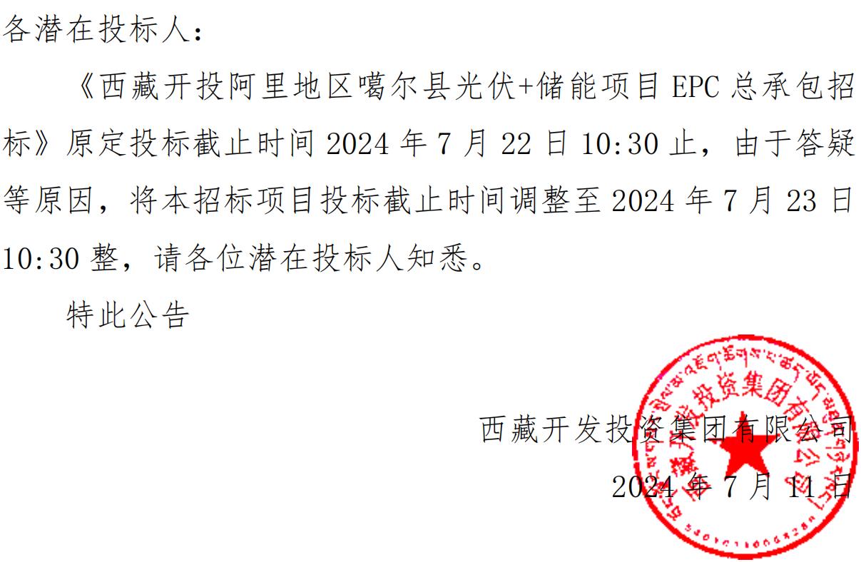 關(guān)于延長(zhǎng)《西藏開投阿里地區(qū)噶爾縣光伏+儲(chǔ)能項(xiàng)目EPC總承包招標(biāo)》投標(biāo)截止時(shí)間的公告