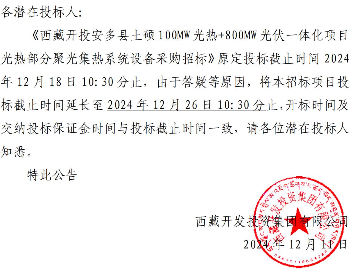 關(guān)于延長《西藏開投安多縣土碩100MW光熱+800MW光伏一體化項目光熱部分聚光集熱系統(tǒng)設(shè)備采購招標》投標截止時間的公告